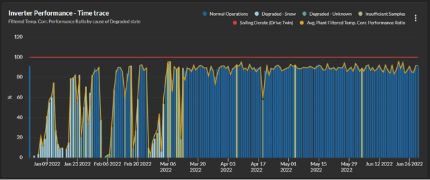 To ensure a robust baseline of diagnostic analysis, Power Factors incorporates independent weather data (including precipitation data) for all monitored locations. This enables our second layer of diagnostic analysis to classify outages and underperformance due to snow with a similar degree of confidence to the experienced PV analyst — all with a relatively low set of baseline requirements that we ensure are met for all systems.